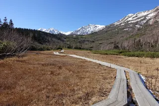 自然園の中は、木道を歩く湿原地帯、登山道どちらもあって、コースの一番奥に、白馬三山を臨む展望スポットがある。